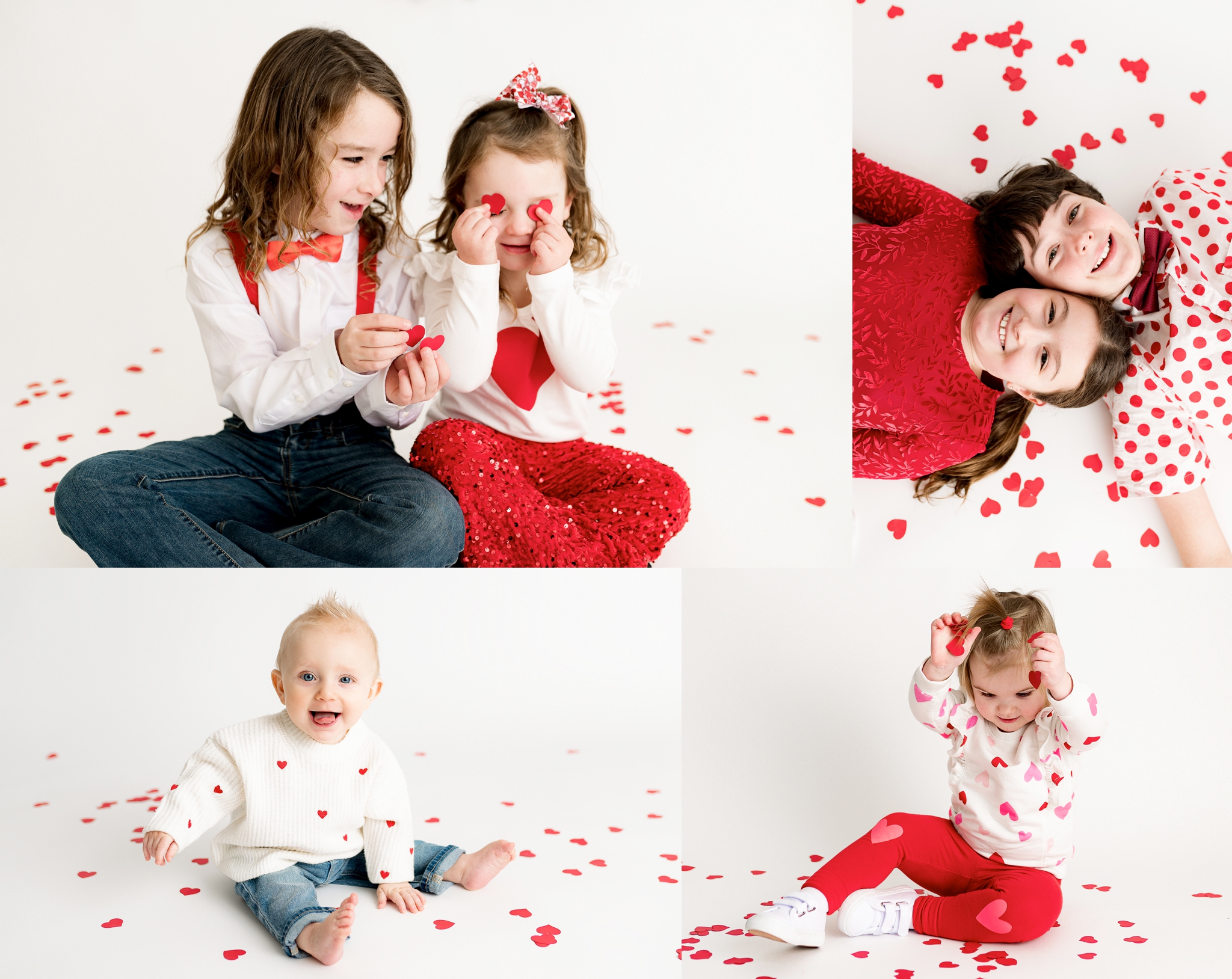 A crisp white backdrop with red heart confetti tossed and thrown by the kids for a playful, carefree Valentine feel. Full of movement, laughter, and natural smiles — these sessions are all about capturing genuine joy and fun-filled moments.
